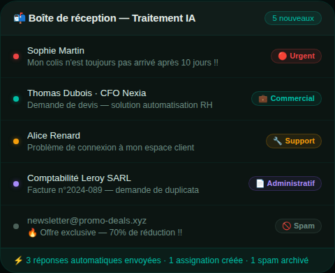 Un agent IA analyse chaque email entrant, détecte l'intention, classe la demande, rédige une réponse adaptée et alerte la bonne personne et le tout sans que vous leviez le petit doigt!